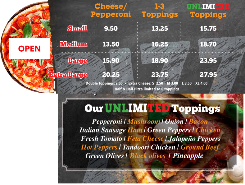 pepperoni, mushroom, ham, green peppers, onion, bacon and olives